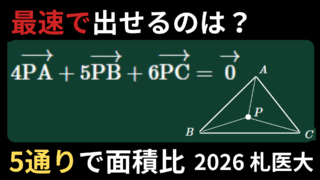 問題2026年の札幌医科大学で出題された問題です。典型問題ですが、面積比だけを求めるのであれば、このあと解答中に出てくる線分BC上の点Dなどは不要です。平面に三角形 $ \mathrm{ABC} $ と点 $ \mathrm{P} $ があ...