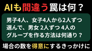 Chat GPT もGemini も正解できなかった、組み合わせの問題です。男子4人、女子4人から2人ずつ選んで、男女2人ずつ4人のグループを作る方法は何通り?YouTube 動画解説ポイントは重複の解消ダブルカウントしているものを見つけら...