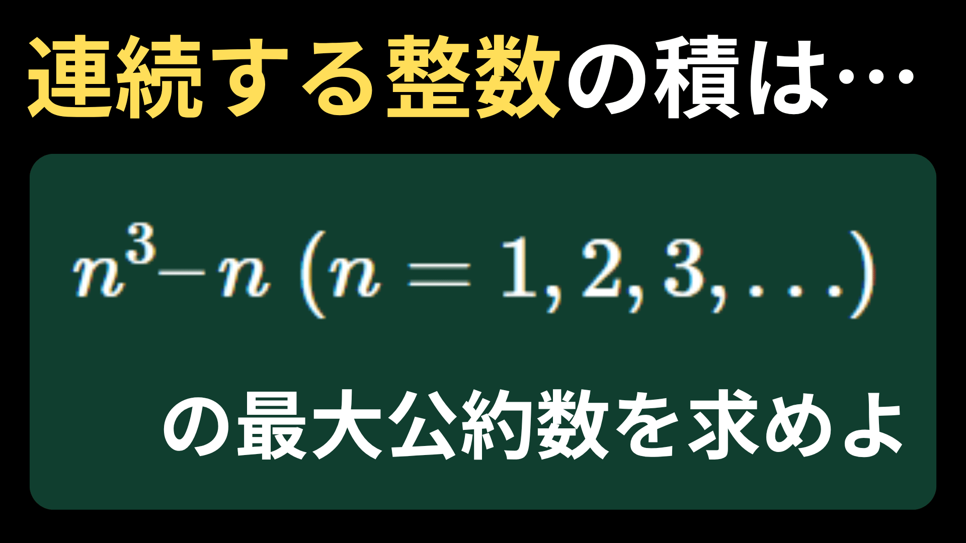 一方, \[ a_n=n^3-n=(n-1)n(n+1) \] であり,$n-1,\ n,\ n+1$ は連続する3整数であるから,この積は常に $2$ および $3$ で割り切れる。