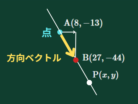 方向ベクトルの向きが逆になっても、点Aでなく点Bから描いても同じ直線になるので、